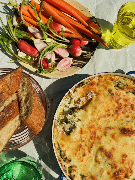 Artichoke dip is impossible to ignore. When that hot dish hits the table, it’s like time stops and everyone turns their attention to the bubbling, cheesy appetizer before them. Why then, should this dip with main-character-energy be relegated to an appetizer? I’m giving artichoke dip the entrée spotlight it deserves, with the help of tinned trout for a little more heft. To serve, I’d recommend plenty of crunchy vegetables and crusty bread for schmearing, plus a big, simple salad on the side.