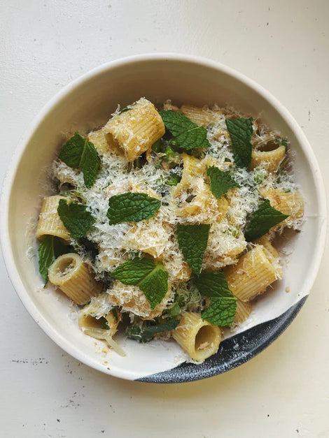 - Plate in your preferred bowl, shower in grated pecorino, and finish with torn mint and a good grind of black pepper.