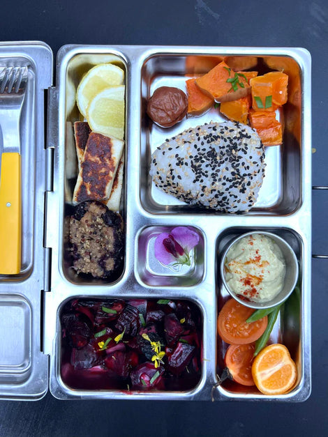 - Cover the surface of a 6” plate with black and white sesame seeds. Prepare one small finger bowl of water per person.