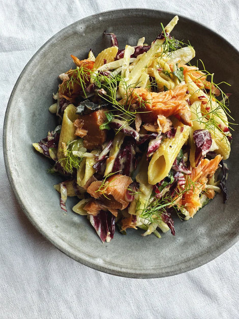 Enjoy a fresh twist on a classic with this Caesar Salad Pasta Salad, featuring penne, smoked salmon, radicchio, fennel, olives, and a homemade Caesar dressing with anchovies and parmesan. Perfect for summer picnics or light lunches!