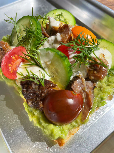 Enjoy a delicious and easy-to-make Campfire Cod Avocado Tartine with a blend of avocado, lemon, and garlic aioli on toasted focaccia. Perfect for a flavorful snack or light meal.