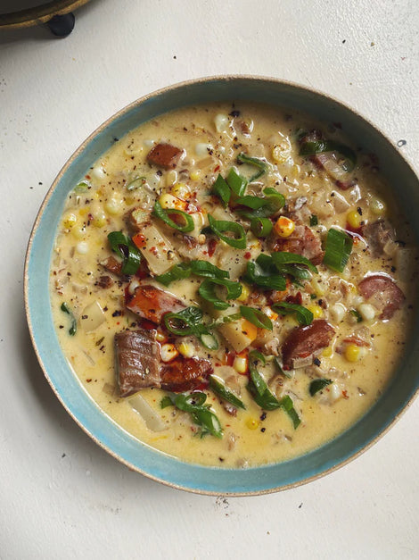 Campfire Cod & Bratwurst Chowder is a hearty and flavorful soup featuring smoky cod, savory bratwurst, creamy potatoes, fresh corn, and thyme. Perfect for cozy dinners, this chowder combines rich flavors for a comforting dish.