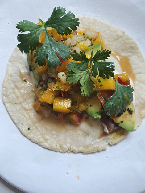 These Campfire Cod Tacos with Peach and Yellow Tomato Salsa are the perfect summer bite. Topped with a tangy lime crema and a hint of spice, they are bursting with fresh flavors!