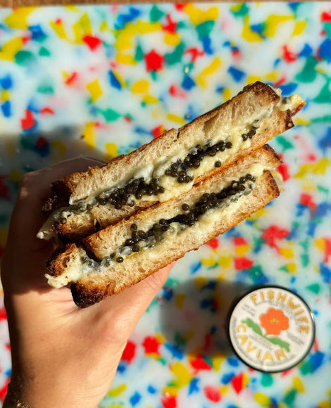 Elevate your grilled cheese game with this luxurious recipe, featuring layers of sharp cheddar and Fishwife caviar, grilled to golden perfection on sourdough bread!