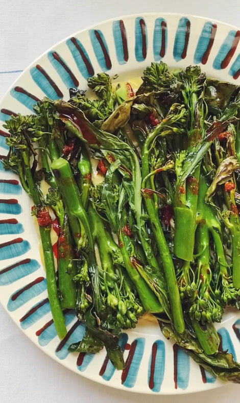 - To assemble, add the ‘tonnato’ to a large plate. With the back of a spoon, schmear the tonnato to cover the surface of your chosen plate. Cover with the charred broccolini and finish with a drizzle of calabrian chili oil.