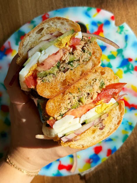 Enjoy the bold flavors of a Classic Pan Bagnat, made with Fishwife Spicy Tuna, olives, anchovies, fresh herbs, and a medley of fresh veggies. This flavorful, pressed sandwich is perfect for picnics or make-ahead meals.