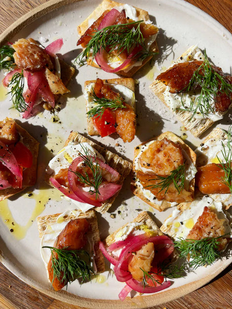- Top crackers with a schmear of cream cheese, a Rainbow Trout Jerky Gem, a sprig of dill