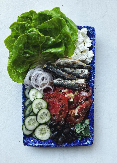 - To assemble each bite, grab a lettuce cup and load it up with all of the goodies. My preferred way to build a bite is: lettuce, then tomato, cucumber, red onion, sardine, olives, feta, and oregano to finish. Enjoy with friends!
