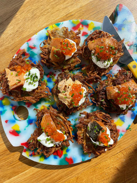 Try these crispy Fishwife Latkes, topped with sour cream, flakes of Fishwife tinned fish, salmon roe, and fresh chives. A delicious and savory twist on the classic latke, perfect for any occasion!