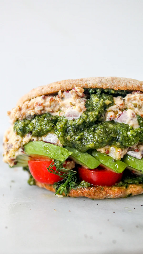 Savor the delicious Fishwife "Trout-acado" sandwich, featuring a creamy trout mixture with dijon, capers, and red onion, paired with homemade pesto, avocado, and tomatoes on toasted flatbread. A fresh and flavorful meal!