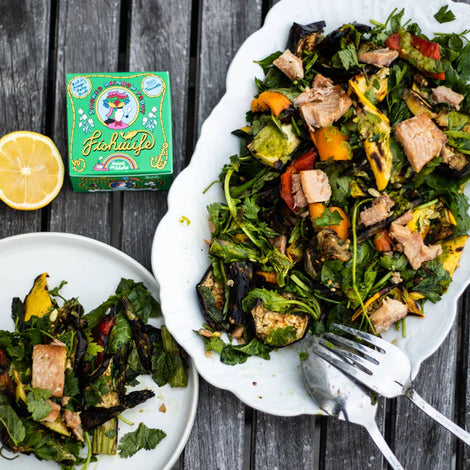 A vibrant Grilled Veggie Salad with smoky Fishwife Trout and a zesty herb vinaigrette. Perfect for a refreshing summer meal or side dish packed with flavors and fresh herbs.