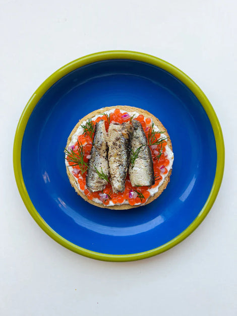 Upgrade your bagel with creamy cream cheese, Fishwife Little Sardines, trout roe, diced red onion, and a drizzle of olive oil. Topped with fresh dill, this savory Sardines Bagel makes for a perfect, flavorful breakfast or snack.