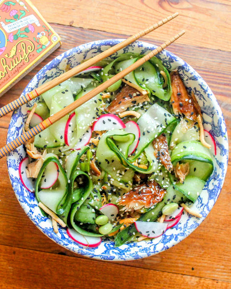 Refresh with a Mackerel Cucumber Salad featuring Fishwife Slow Smoked Mackerel, cucumber ribbons, avocado, radish, edamame, and a flavorful soy-sesame dressing. Topped with crunchy noodles and sesame seeds, this salad is a perfect balance of spice and crunch!