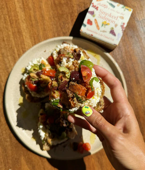 Savor Marinated Tomato and Olive Toast with flaked Fishwife Smoked Salmon, juicy grape tomatoes, olives, fresh basil, and creamy ricotta on toasted sourdough. A fresh and flavorful dish perfect for a quick snack or light meal!