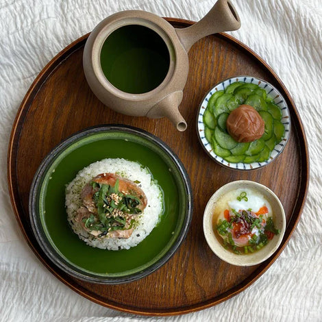 A comforting bowl of Matcha Ochazuke, featuring dashi-infused matcha poured over rice, smoked salmon, and topped with Japanese pickles and shiso leaves. A light, flavorful dish inspired by traditional Japanese cuisine.