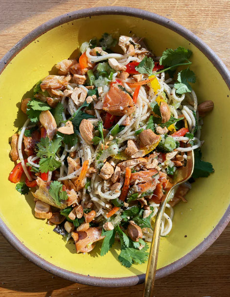 Enjoy a flavorful bowl of Rainbow Noodles with Umami Sauce and Smoked Salmon, featuring tender Chinese noodles, vibrant veggies, and toasted cashews. Topped with fresh herbs and drizzled with savory Mila Umami Sauce for a delicious, colorful meal!