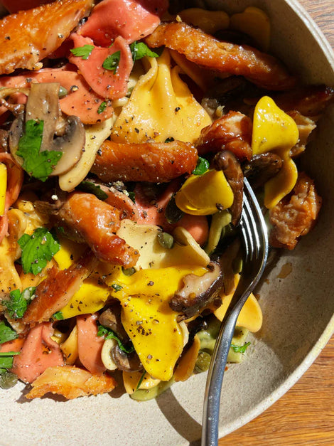 This Rainbow-Tie Jerky Gems Pasta combines flavorful Rainbow Trout Jerky Gems, roasted mushrooms, and fresh cilantro with bow-tie pasta. A drizzle of olive oil and a squeeze of lemon elevate this quick and delicious dish!