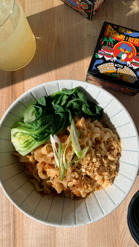 - Add noodles to sauce and thoroughly mix to combine. Add Fishwife Smoked Salmon and any remaining chili oil to the bowl. Mix. Top with chopped peanuts, green onions, and baby bok choy. Enjoy!