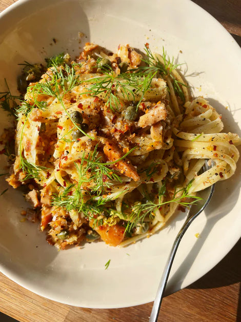 Sara Tane's Trout Pasta is a smoky, savory dish featuring Fishwife Smoked Trout, capers, and fresh herbs. A perfect weeknight meal with simple ingredients that come together for a flavorful pasta experience!