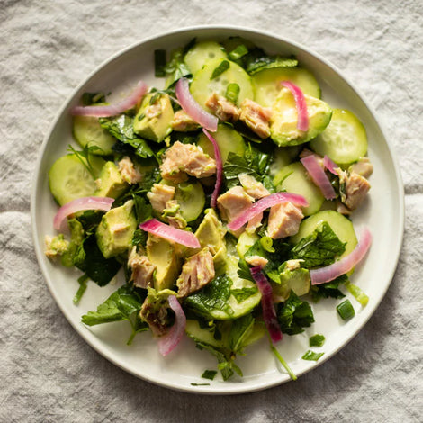 - Use your hands to break tuna into bite-size pieces, directly into the empty mixing bowl. Add avocado, pickled onion to taste, and 1 tablespoon of pickling liquid from the jar, and mix gently with your hands to dress. Scatter over the cucumber mixture, and season with salt and pepper. Cover with torn herbs, and generously drizzle with olive oil. Serve and enjoy!
