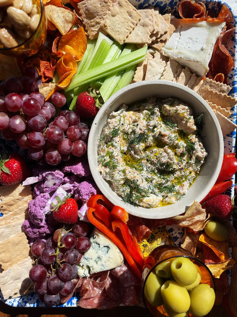 - In a medium bowl, mix salmon, cream cheese, yogurt, mayonnaise, herbs, red onion, lemon zest, and lemon juice. Season with salt and pepper to taste. Transfer to a serving bowl and garnish with fresh herbs and Graza olive oil. Serve with crackers and crudite immediately. Store dip in an airtight container for up to 2 days.
