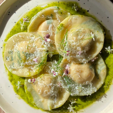 Delight your taste buds with this Smoked Salmon, Goat Cheese, and Labneh Ravioli. Filled with smoky salmon, creamy goat cheese, and lemony labneh, wrapped in handmade herb-laminated pasta, this dish is topped with a fresh herb sauce for a rich, flavorful experience.