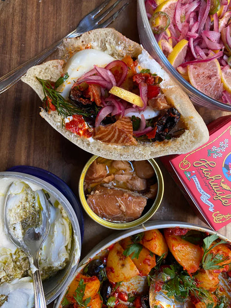 - Now spoon in your various ingredients in layers: start with some harissa potatoes, add in some lemon & onion salad, then a few big chunks of FISHWIFE smoked salmon, and repeat.