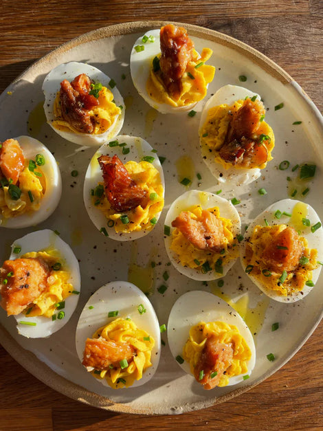 Elevate your appetizer game with these Smoked Trout Deviled Eggs. Creamy yolks mixed with mayo, mustard, and a hint of spice, topped with Fishwife Smoked Rainbow Trout, chives, and paprika for a smoky, flavorful twist.