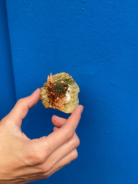 Indulge in a flavorful snack with thick-cut potato chips topped with crème fraîche, Fishwife Smoked Rainbow Trout, pickled mustard seeds, furikake, and fresh dill. A deliciously savory bite perfect for entertaining!