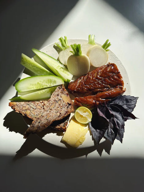 - Assemble all of the ingredients on a plate. You can build little open faced sandwiches, dunk the turnips/radishes in butter, or eat the mackerel plain with your fingers followed by a fresh bite of cucumber - you can’t go wrong!