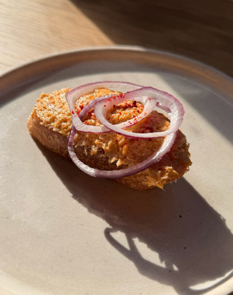 One of the pintxos crafted for our NYC Pop-Up by the chefs behind the James Beard Award–winning Wildair, this bite is the definition of understated perfection. Spicy Albacore Tuna whipped with anchovy, espelette, and mayo—spread on crisp baguette and topped with a few slivers of red onion. It’s briny, creamy, and just a little dangerous. The kind of thing you eat standing up, elbow to elbow with friends, a glass of natural wine in hand, and immediately wish you’d ordered three more.