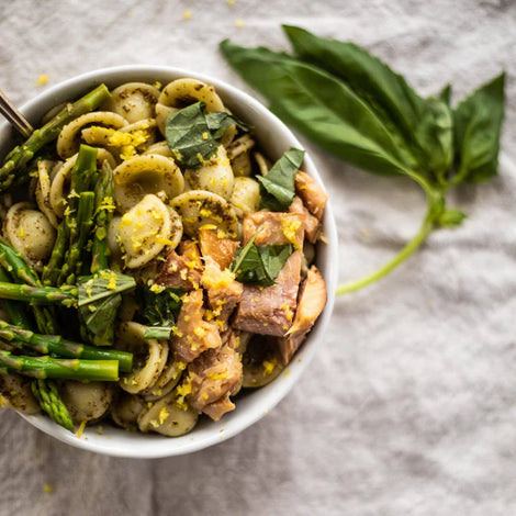 A quick and fresh Spring Pantry Pasta with orecchiette, asparagus, pesto, and Fishwife Smoked Trout, finished with lemon zest and basil. Perfect for a light yet satisfying meal!