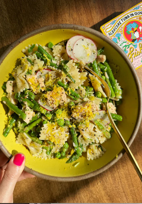 This refreshing Spring Tuna Pasta Salad combines Fishwife Albacore Tuna, farfalle pasta, crisp veggies, and fresh herbs like mint and dill. A light, zesty dish perfect for warm weather or meal prep!