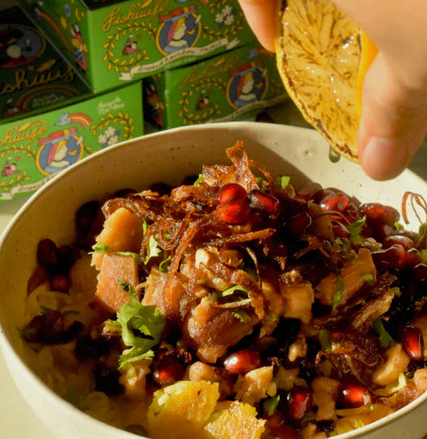 Savor the crispy delights of a Tahdig and Trout Bowl, featuring Fishwife Smoked Rainbow Trout atop golden basmati rice, barberries, walnuts, and a medley of fried onions, garlic, and pomegranate seeds. A flavor-packed fusion of textures and vibrant toppings.