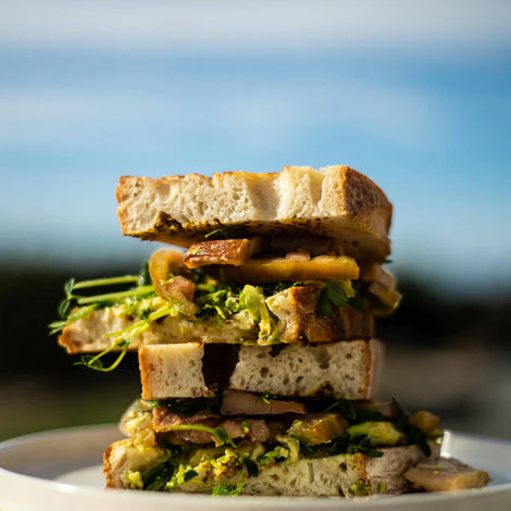 - Heat butter in a small pan. Place the sourdough on the pan until the bread is golden and toasty. Spread the mustard and smashed avocado on one side of sourdough. Top with the tomato slices, greens, trout, dill, and fresh lemon juice. Slice the sandwich in half and dig in!