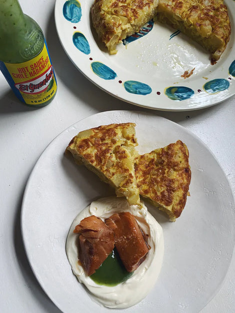 Tortilla de Patatas with Creme Fraiche, Smoked Salmon, and green hot sauce