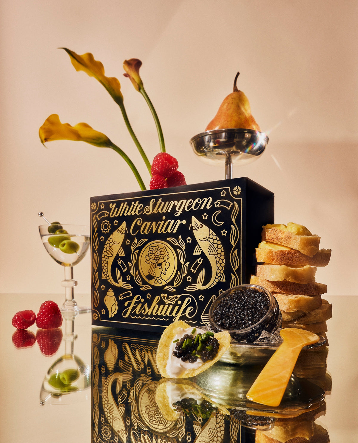 Our California White Sturgeon Caviar is buttery, creamy, a little nutty - amazing with potato chips, crème fraîche, and chives. Each order comes with a custom designed box by Danny "Danbo" Miller as well as a fish-engraved mother of pearl spoon!