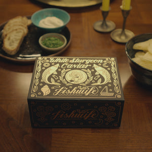 Each order of caviar comes with a custom designed box by Danny "Danbo" Miller as well as a fish-engraved mother of pearl spoon!