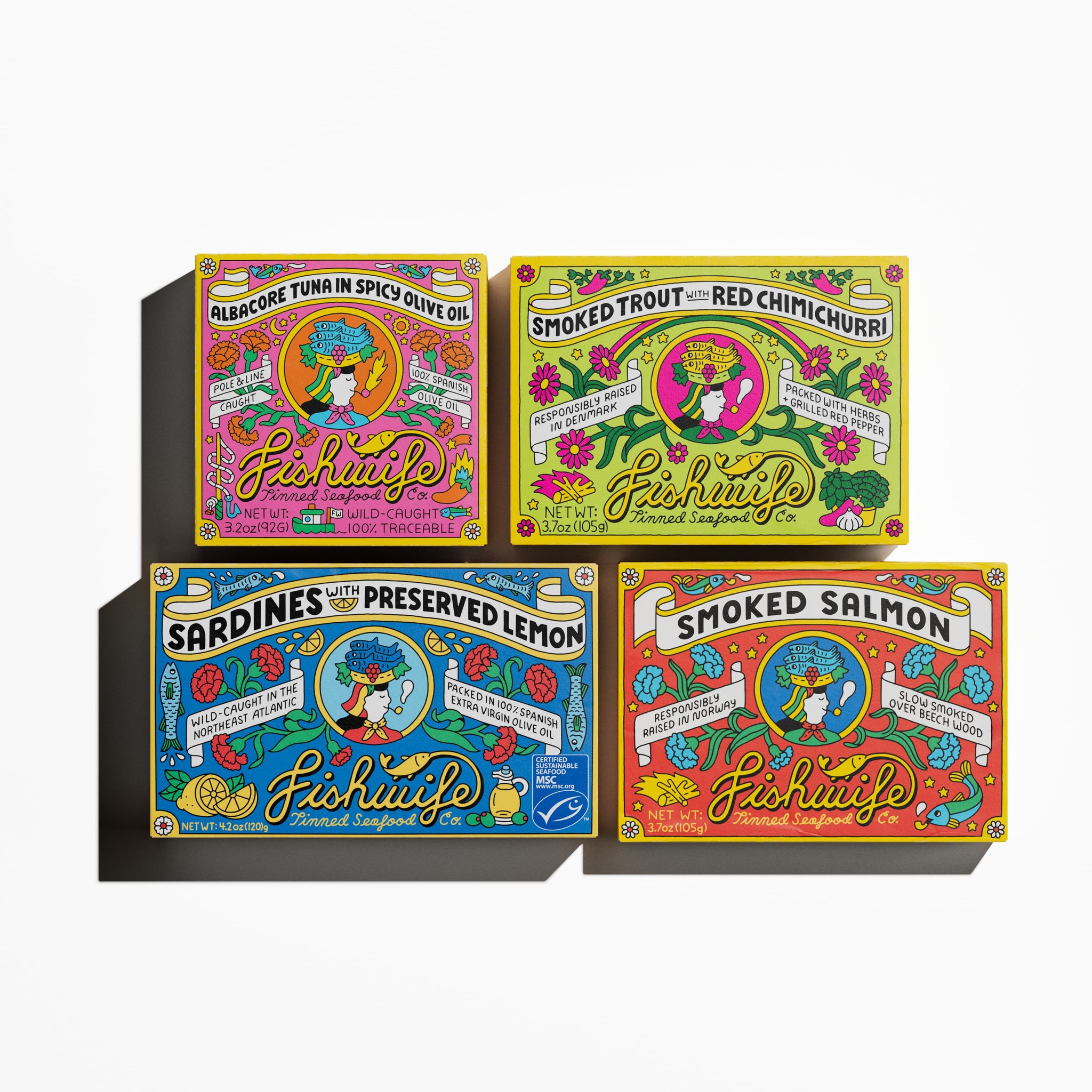 This set includes 4 tins of Fishwife tinned fish (1 tin of each listed): Smoked Salmon, Smoked Rainbow Trout with Red Chimichurri, Albacore Tuna in Spicy Olive Oil, Sardines with Preserved Lemon